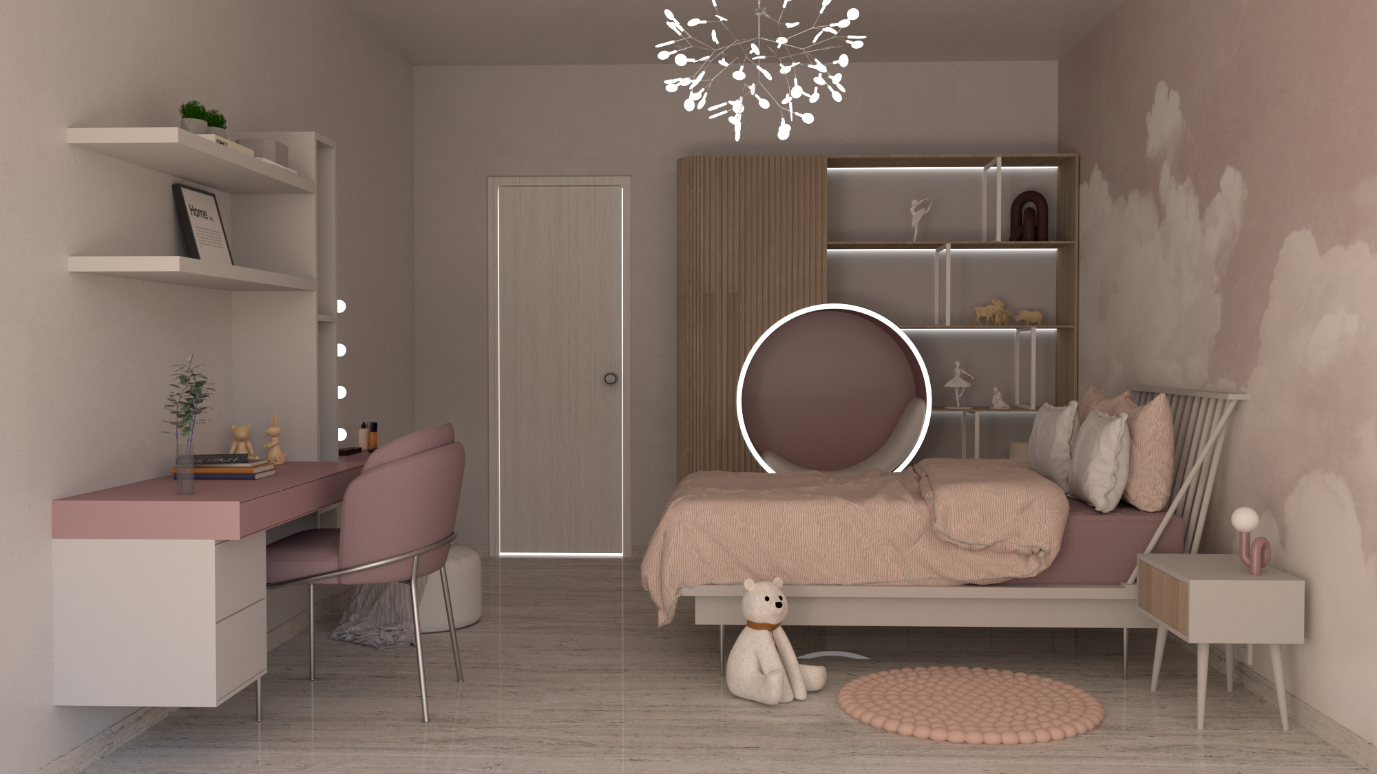 Camera imbina elemente jucause cu o structura ergonomica, creand un spatiu calm pentru studiu si relaxare.
