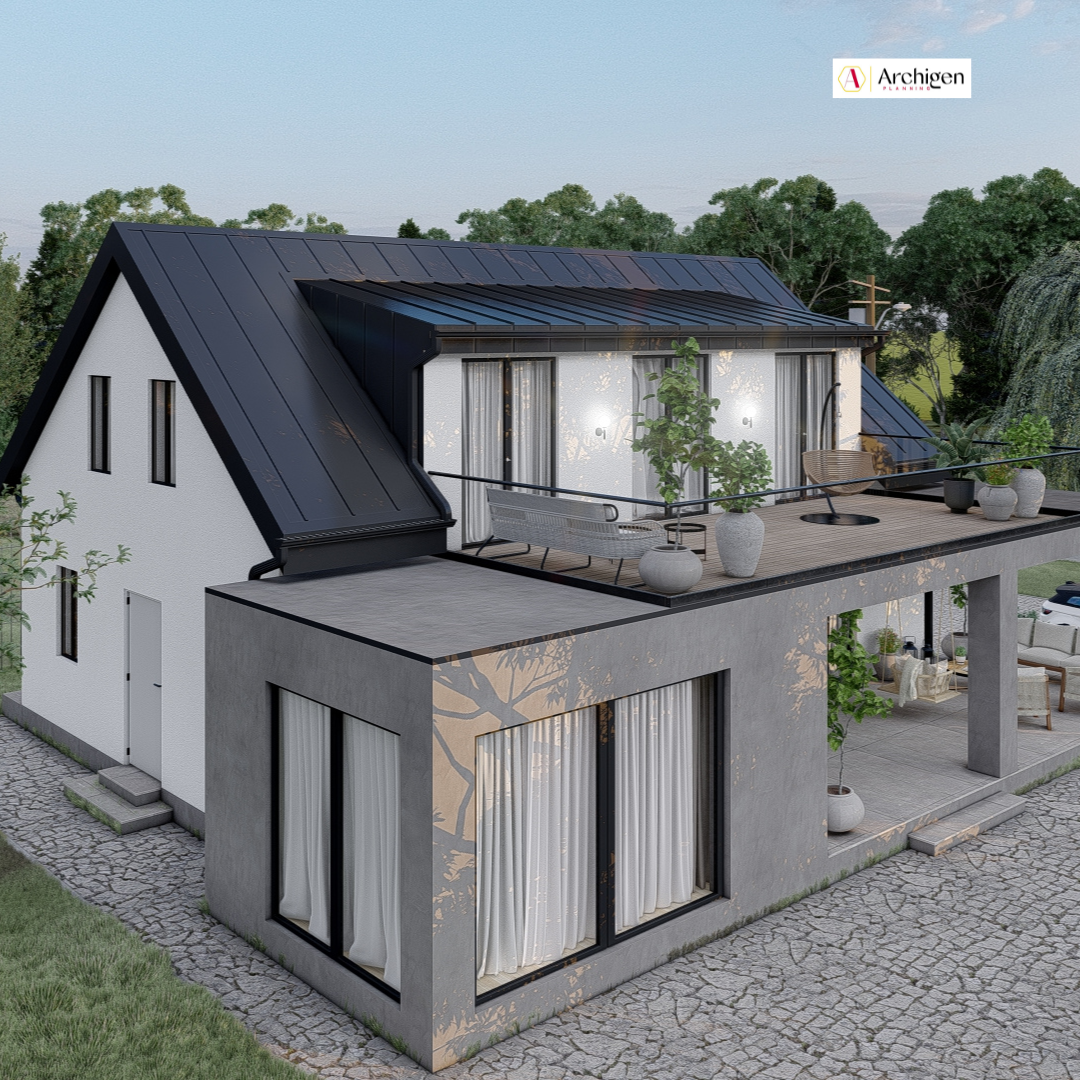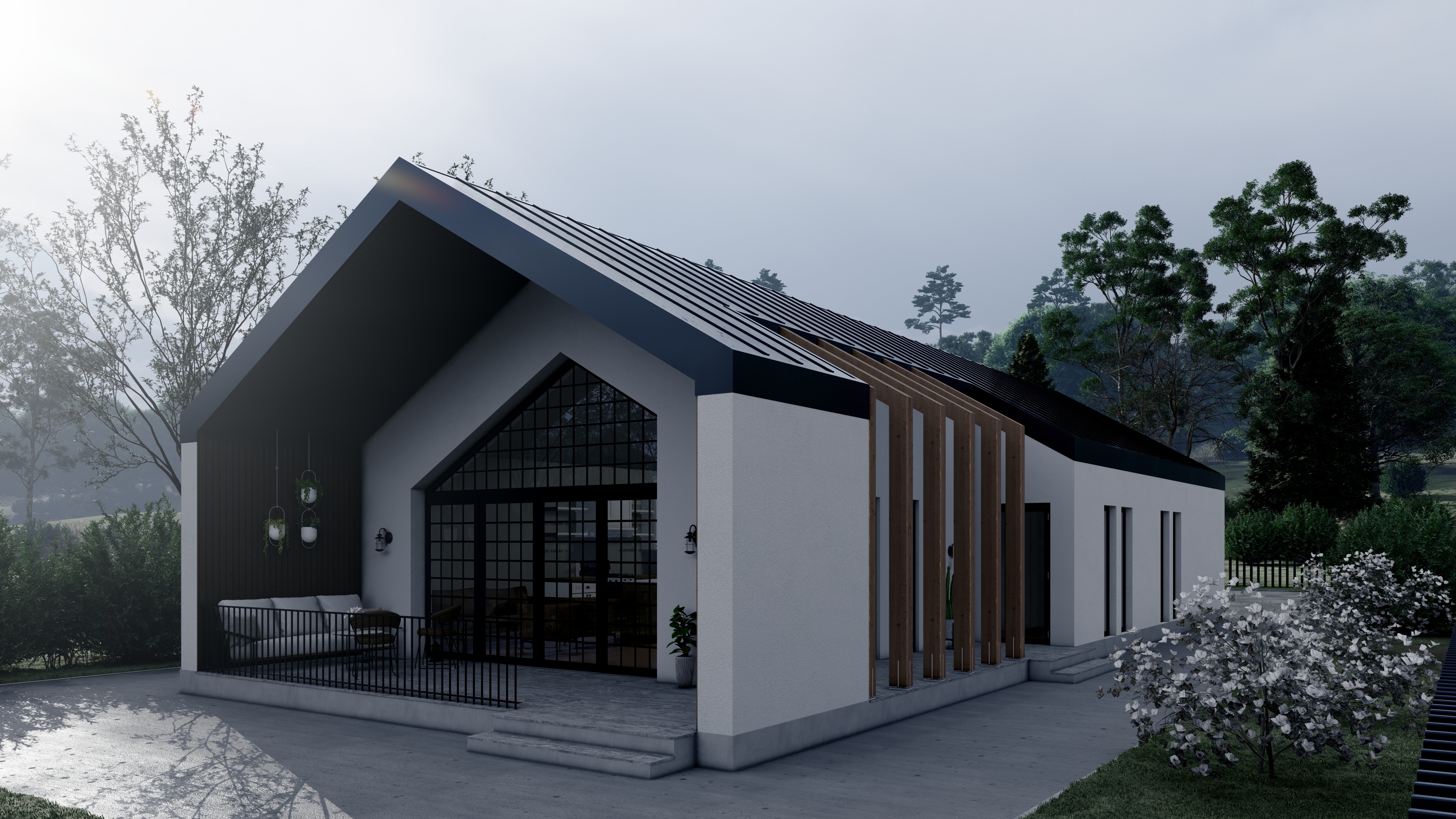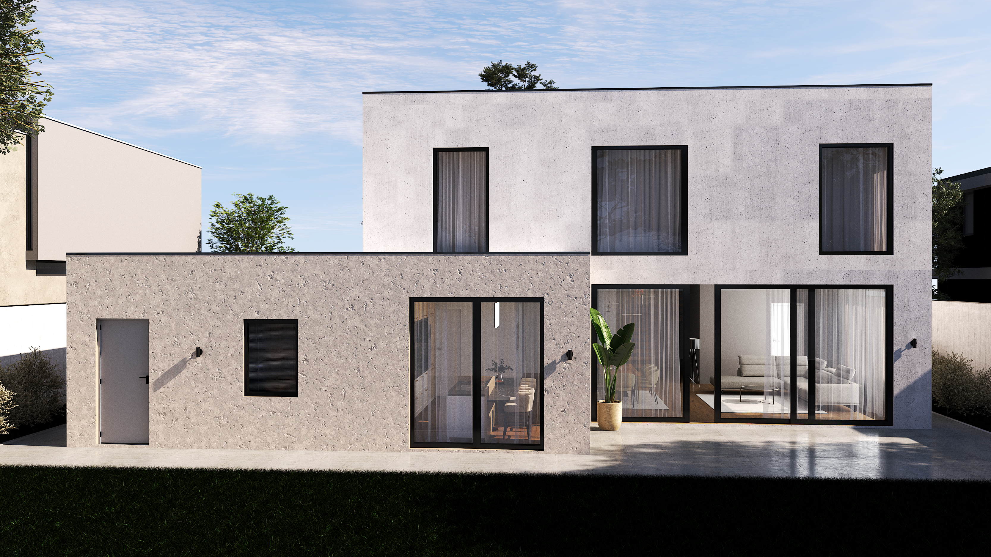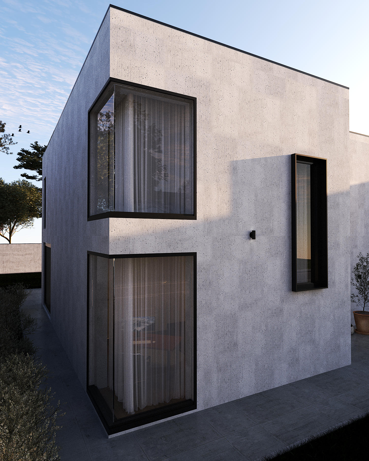 Volumetria cubica si golurile verticale definesc un caracter sobru, dar elegant. Finisajele din beton aparent si cadrele negre creeaza un contrast subtil si sofisticat.